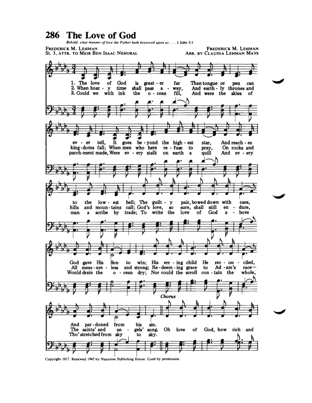 (4)  Lehman, Frederick M. ” The Love Of God.” Written 1917. Published 1919 in Songs That Are Different, Volume 2. http://www.cyberhymnal.org/htm/l/o/loveofgo.htm
