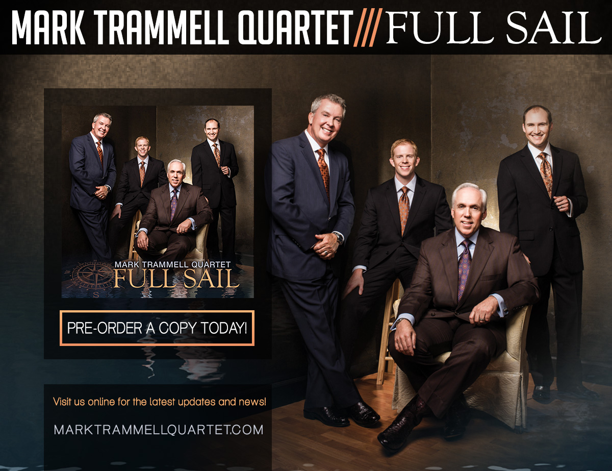Full Sail can be pre-ordered on the Mark Trammell Quartet website by visiting this link —> http://bit.ly/MTQfullsail.  To view the Official Video Trailer for Full Sail, please visit the Mark Trammell Quartet Facebook page. The Official Album Trailer includes segments of the quartet sharing their favorite part of the recording process, the theme behind the project and brief audio clips of select songs.  “Already In Canaan Land,†a quartet song written by Rodney Griffin, is the first single from Full Sail and will be sent to radio this week.     Â