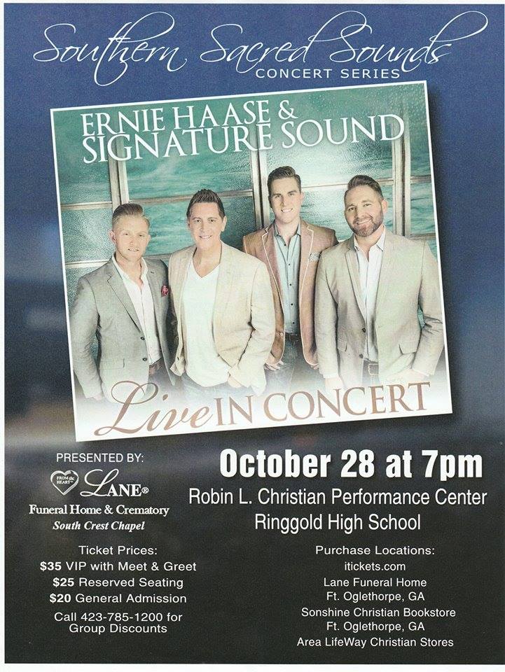 Ernie Haase and Signature Sound are scheduled to appear in the next installment of the Southern Sacred Sounds series, to be held in Ringgold, Georgia, at the Robin L. Christian Performance Center on October 28 at 7:00 p.m. Tickets can be purchased at itickets.com.